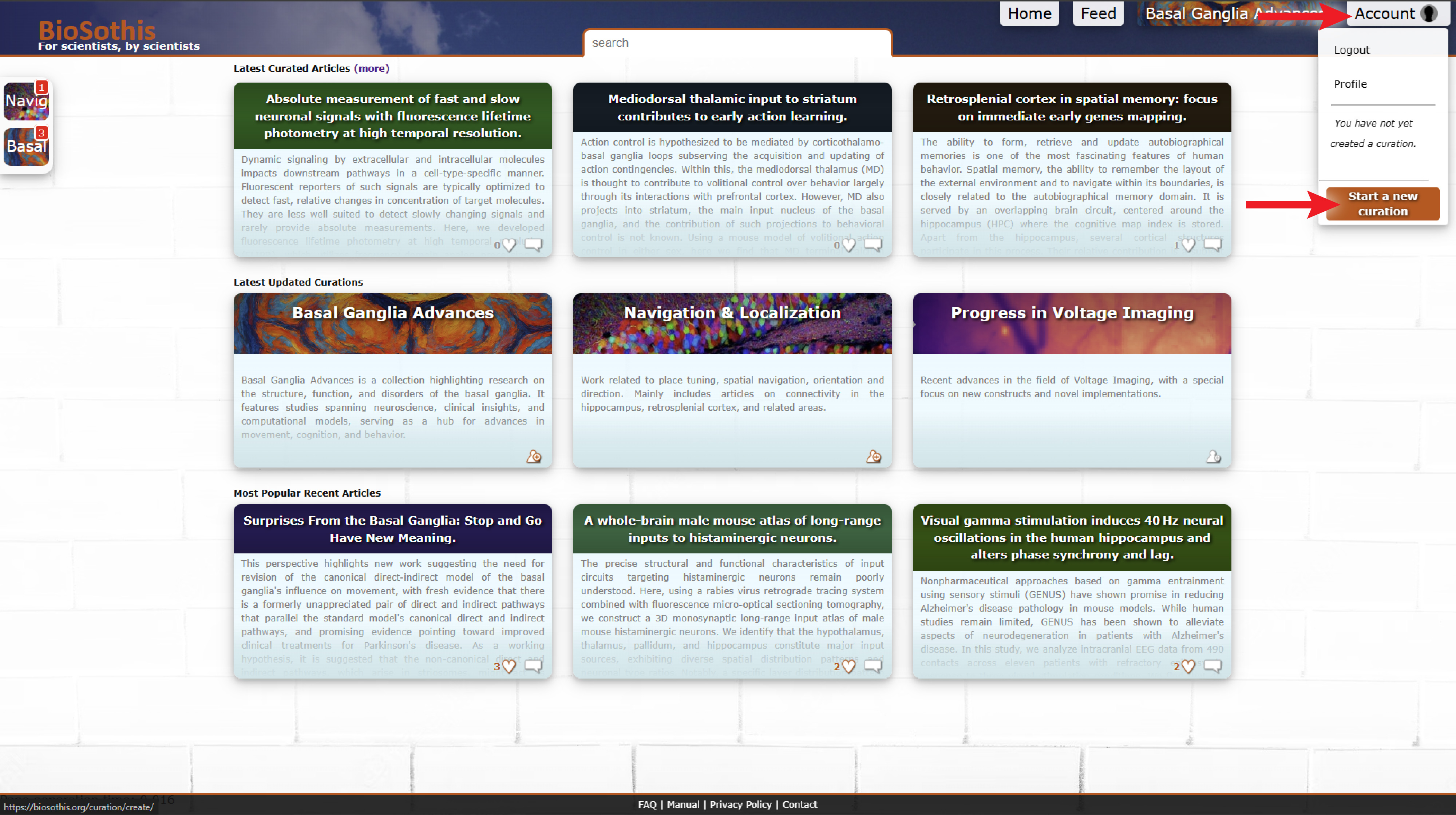 1. Create a new curation. You will find the button to create a new curation under Account, in the top-right corner. You can make as many curations as you like, and switch between them through the Account drop-down.