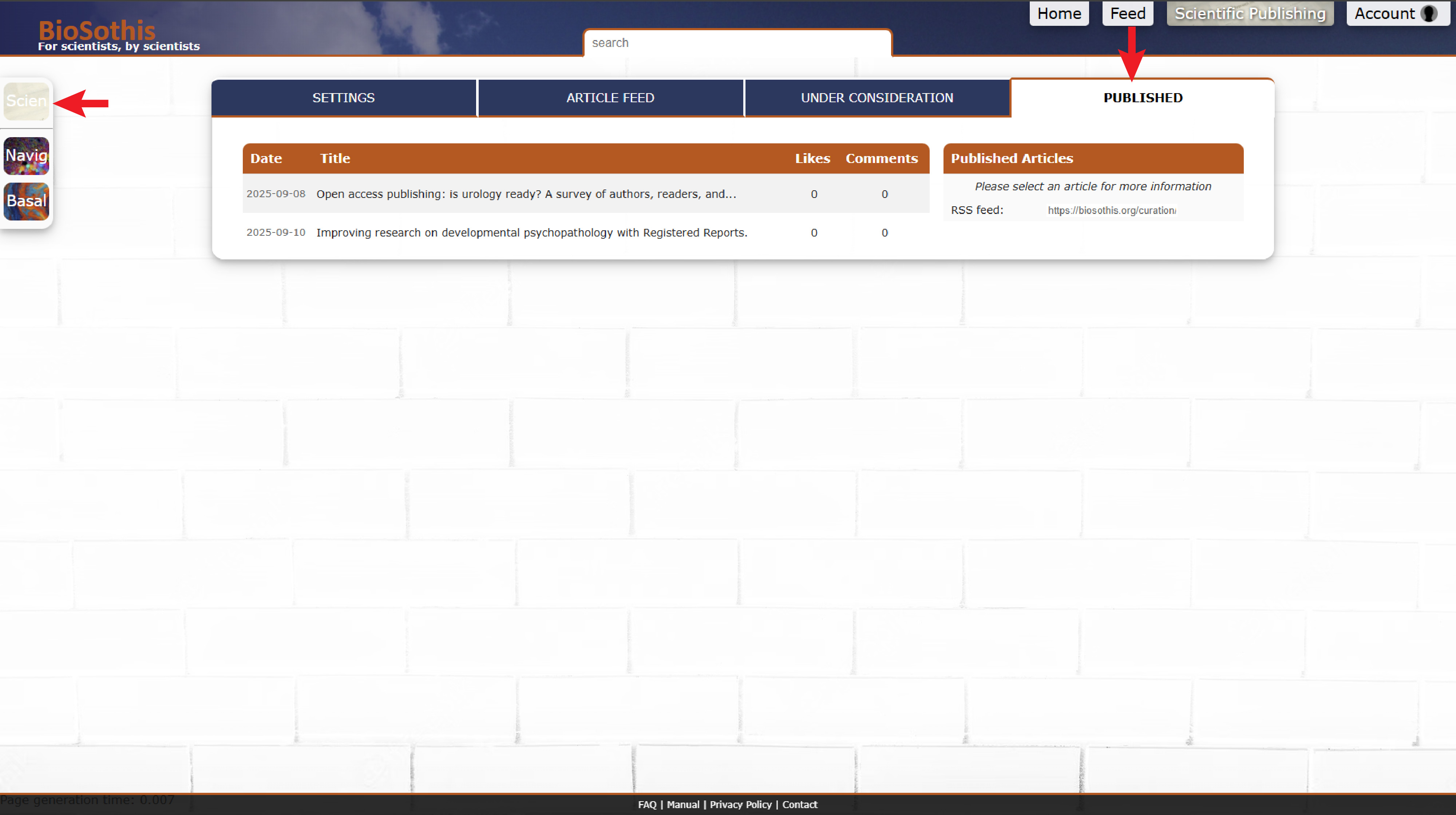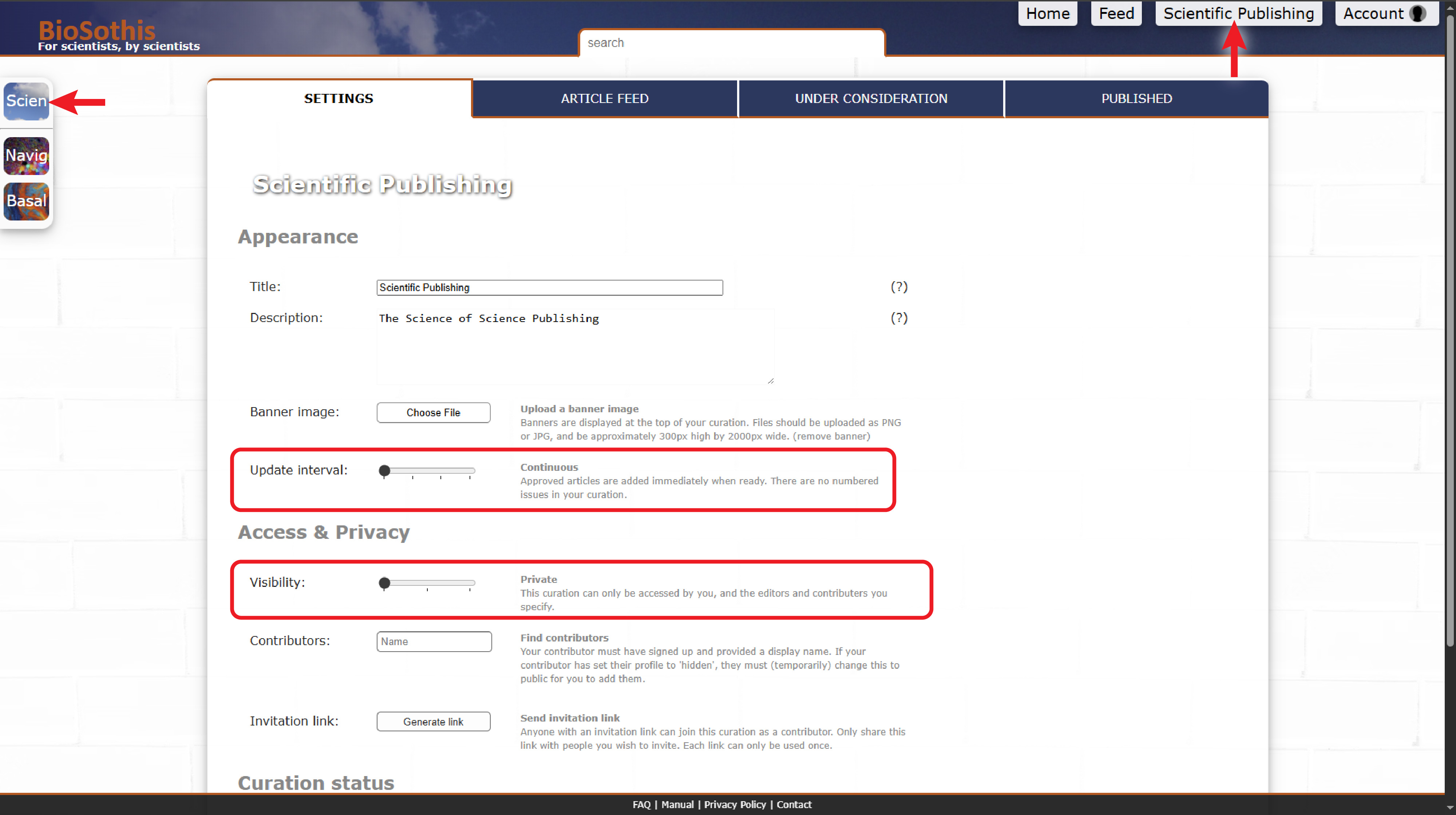 7. The Published tab shows published articles. These are articles visible to your readers, if your curation is set to unlisted or public. Clicking on a published article here allows you to edit the public and private notes, change its visibility (e.g. to retract an article), and read any user comments. The information panel also links to the article RSS feed, which for unlisted and public curations, can be imported into Zotero. To see your curation as it appears to others, you can view it by clicking on its icon in the left sidebar.