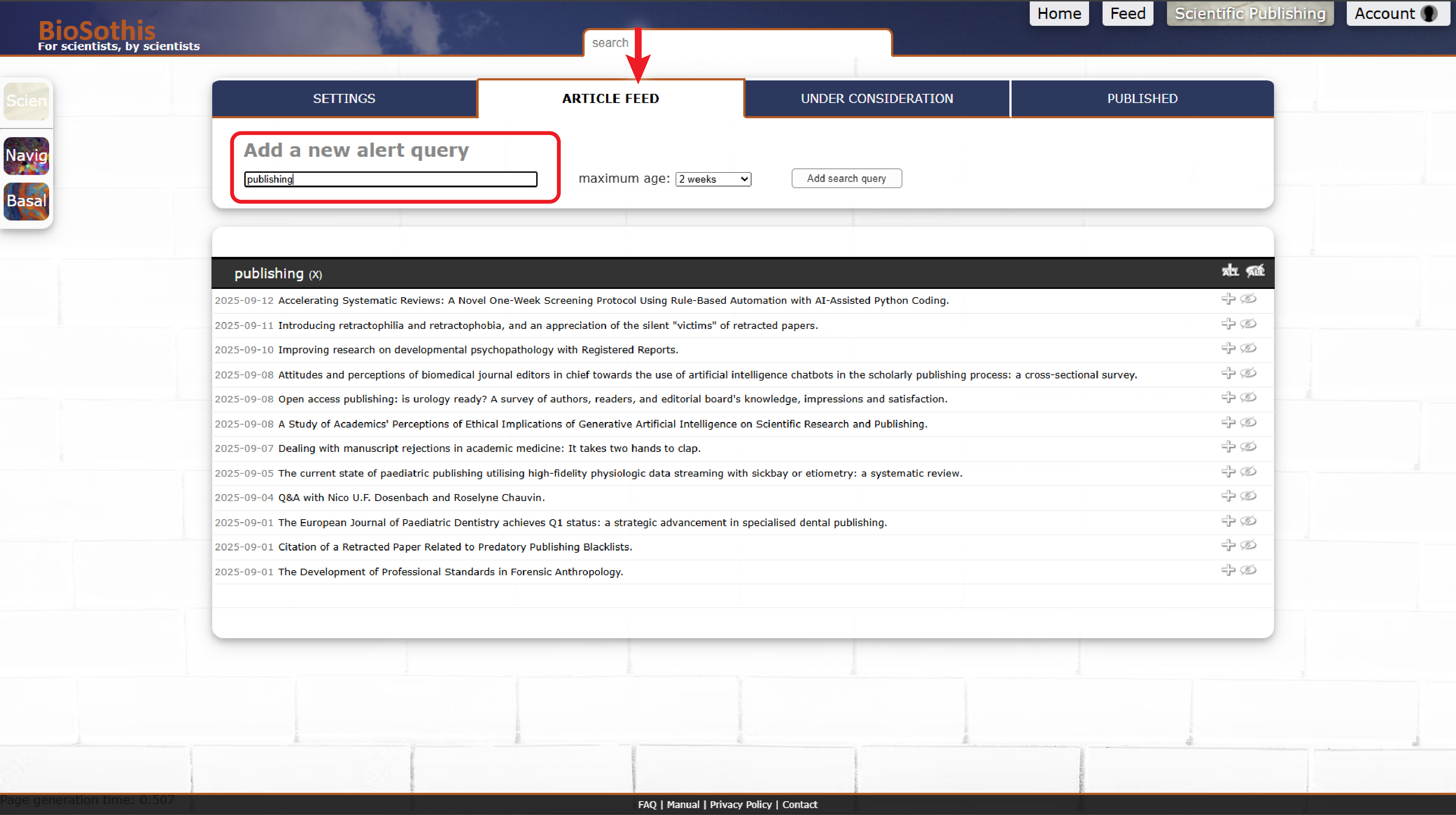 4. Configure your article feed. While you can manually search for and add articles to your curation, the recommended approach is to set-up keyword searches in your Article Feed tab. You can configure as many keywords as you wish. Any articles published within the set interval that match your keywords will appear here. If an article matches multiple keywords, it will appear under each keyword.