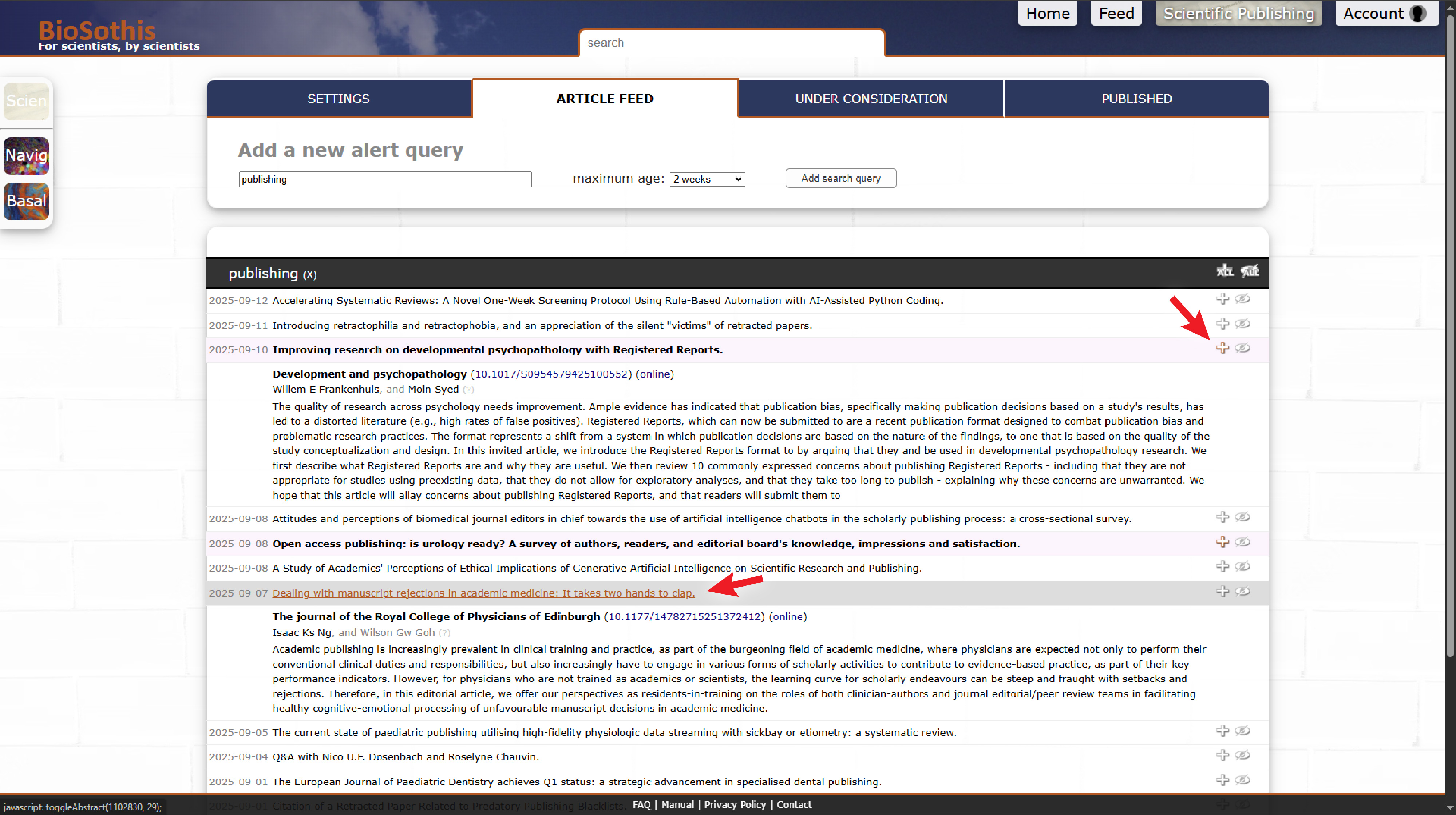 5. Select articles of interest. A key strength of BioSothis is the ability to quickly select articles of interest, and discard the rest. Clicking on an article title will expand it, showing you the full abstract, author list, and venue of publication. Due to technical limitations, please be aware that the order of authors may not match the author order as published. Use the full article links to see the article online, as it is published.
