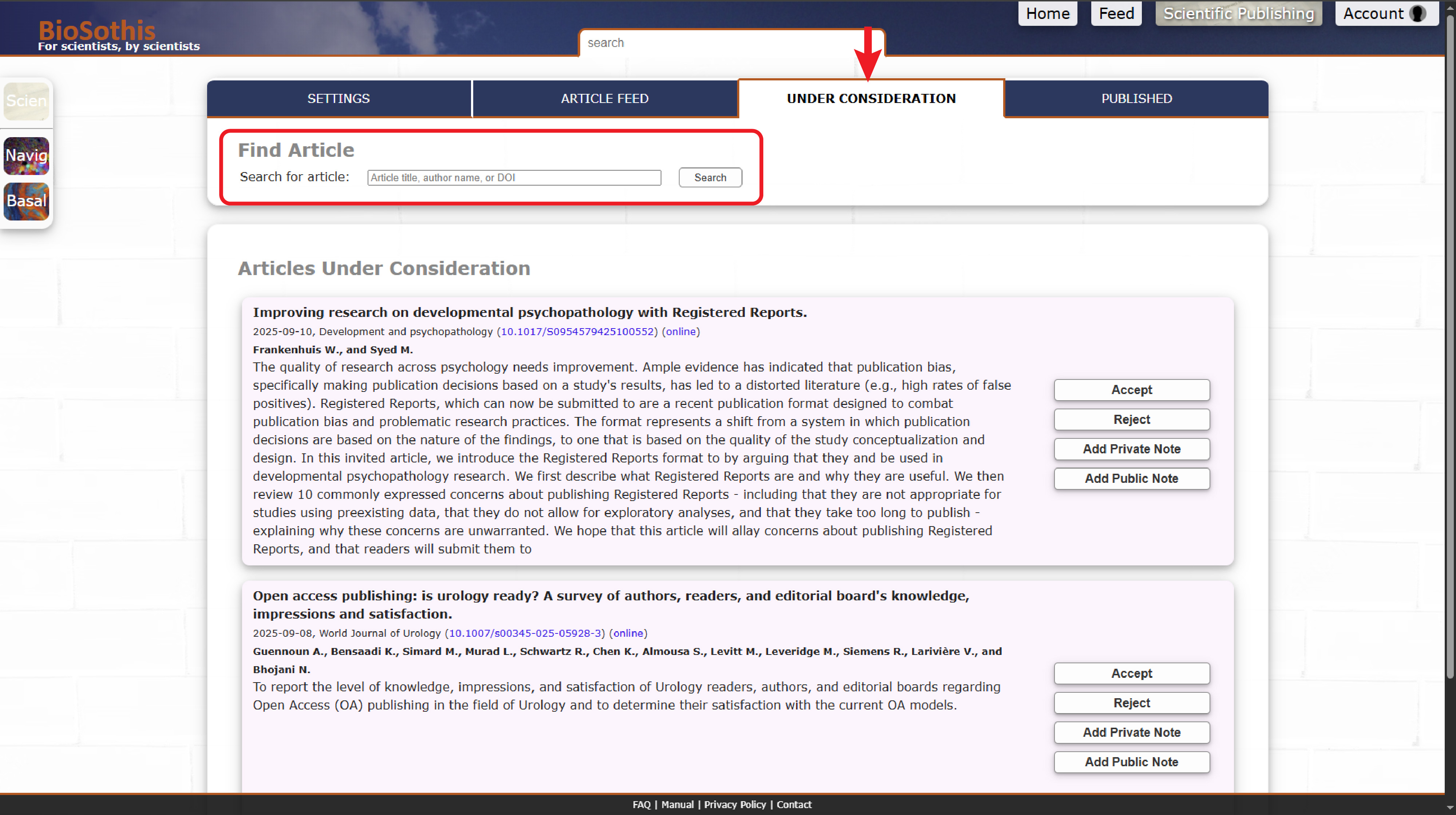 6. Evaluate articles under consideration. In the 'Under Consideration' tab, you can see articles you are considering, as well as articles already approved but not yet published, if your curation is set to weekly or monthly issues. For each article, you can add a private note to other contributors to your curation, as well as a public note readable by anyone who views this article.